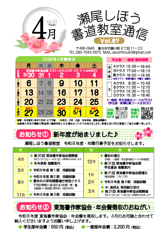 【令和7年4月のよてい♪】1年生『はな』2年生『すみれ』3年生『三川』4年生『作文』5年『成長』6年『地球』中1『松林(行書)』中2・3『八重桜花吹雪(行書)』